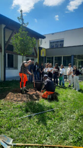 Gruppo di alunni di classe prima che hanno frequentato il laboratorio di scienze, tenuto dalla prof.ssa Breda, durante la piantumazione di un albero nel giardino della scuola “Don Milani”, in occasione della Giornata della Terra.
